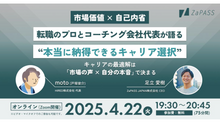 8度の転職で年収を240万円から1,500万円まで引き上げたmoto氏(戸塚俊介氏)と、ZaPASS JAPANの足立愛樹氏が、「自己内省」を軸にキャリア選択の質を高める方法を語ります。年収などの一般的な市場価値にとらわれすぎず、納得できるキャリアを築くための実践的なヒントを解説します。