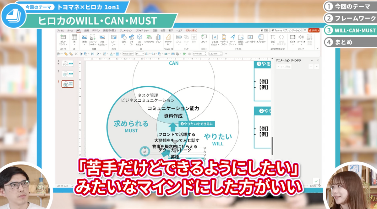 豊間根:はい、はい。やはりこれがヒロカの明確なWILLとしてあって。整理されていると、ヒロカのWILLにもつながるのか。これはどっちかというと、こっち(CANとWILLの重なりの中)か。うーん。そうね、やはりこういう図があると自分の頭も整理されるし。上司とかと話をしている中でも、要は「今、どこの話をしているんだっけ?」とか。