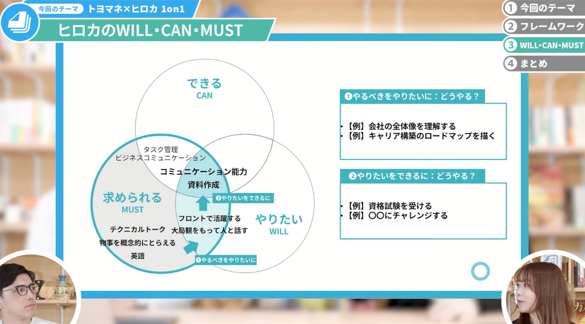 豊間根:それで、使うフレームワークというのが、これは本当に聞いたことがある人は、めちゃくちゃ多いと思います。「WILL・CAN・MUST」ですね。やりたいこと、できること、求められていること、この3つの重なりによって自分の仕事とかスキルを整理しようというフレームワークですね。確か、リクルートが作ったらしい。