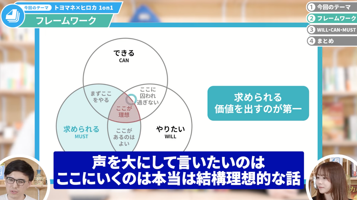 豊間根:けっこう批判的な話もあったりするんだけど、今回はこれを使って整理してみようかなと思っています。WILLが、要は自分がやりたいと思っていることですね。CANができること。MUSTは、やるべきこと・やらなければいけないことなんだけれども。ここでは、あえて「求められること」っていうふうに表現をしています。
