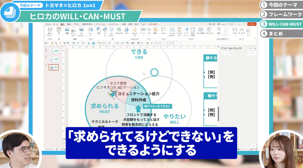 豊間根:あと、求められているし、自分もやりたい。だけど、今はまだ自分にはできない。という、ここ(MUSTとWILLの重なり)があるのは、いいですよね。ここをできるようにしていくと、仕事がどんどんおもしろくなります。
