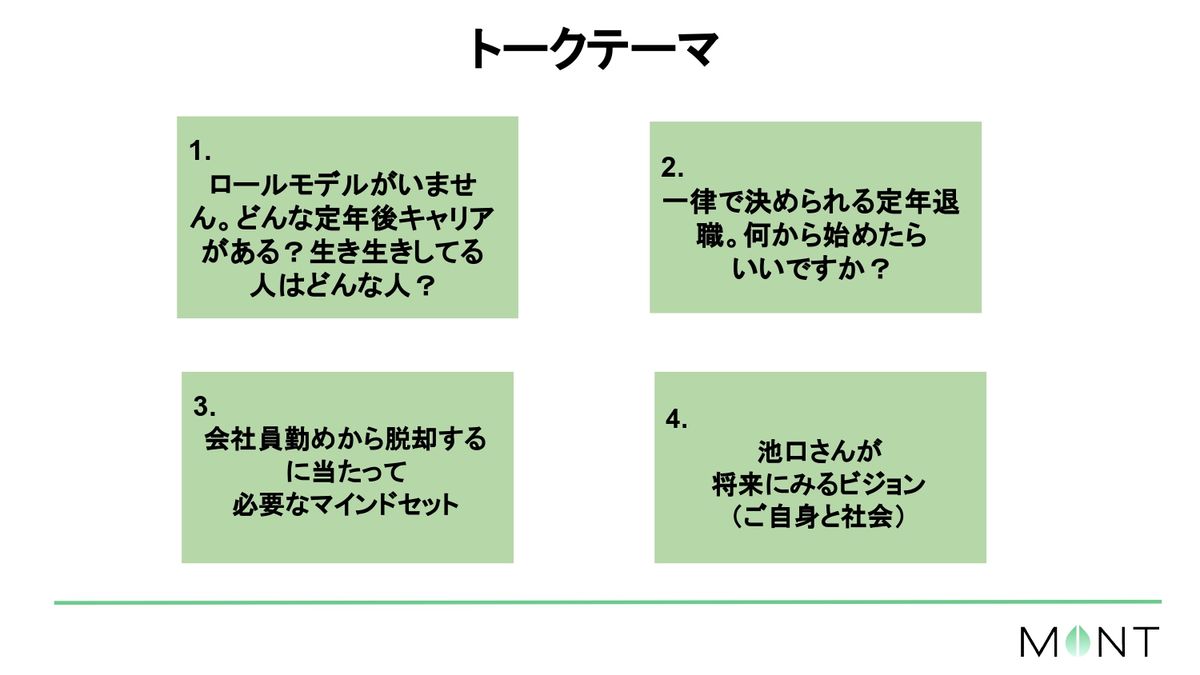 植山智恵氏(以下、植山):今日は池口さんにぜひ聞きたいトークテーマに移っていきたいと思います。(スライドを示して)こちらが事務局で用意させていただいた問いになります。