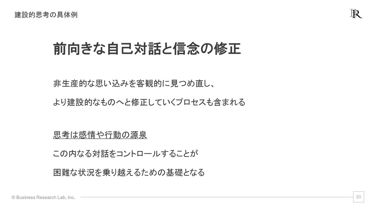 他にも自分に対して前向きな言葉を投げかけていくような「肯定的な自己対話」も建設的思考パターン戦略の1つの要素です。「自分ならできる」というような声をかけたり、あるいは「この失敗は次への糧になる」というような言葉をかけていく。このような前向きな言葉を自分自身に対してきちんと声がけしていくということが、建設的思考パターン戦略の1つになっています。