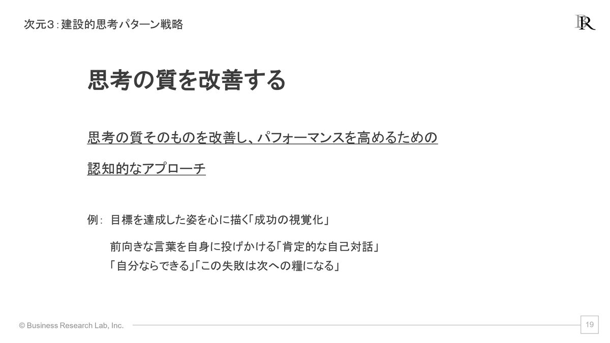 さらに3つ目の次元ですが、今度は物事の捉え方や、自分の認知的なプロセスに対して働きかけるというものです。これを「建設的思考パターン戦略」と呼びます。思考の質を改善するということですね。そのことによってパフォーマンスを高めていこうとする認知的なアプローチに当たるのが、この建設的思考パターン戦略ということです。