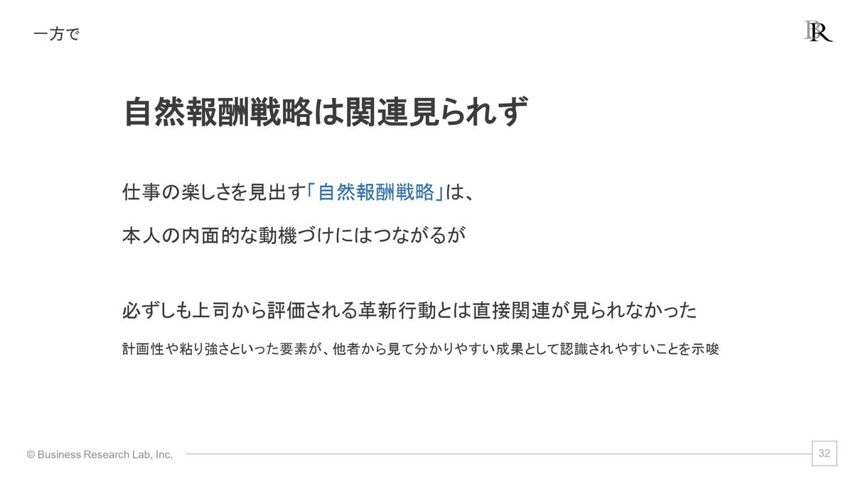 他方で、仕事に内在する楽しさとか価値を見いだしていこうとする自然報酬戦略は、自分自身の内面的な動機づけにはつながっていくんですが、上司が「この人は革新的だ」と評価を行うことは、あまり直接的な関係が見られなかったことがこの研究の中で明らかになりました。あくまで内面的な要素が強いというのが、自然報酬戦略に当たるのかなというところです。