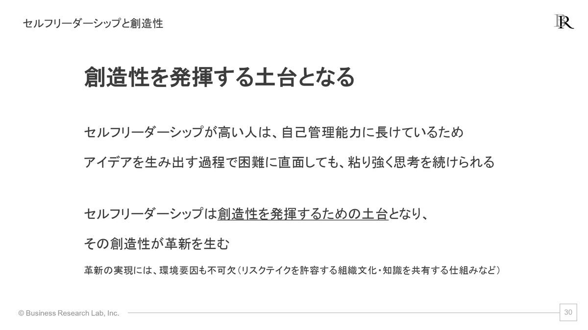他にもセルフリーダーシップによる効果があります。イノベーションやクリエイティビティ、創造性に対しても効果があることがわかっています。ここがセルフマネジメントとの1つの違いかもしれないんですが、新しいことをできるようにもなるというのが、セルフリーダーシップのおもしろいところです。