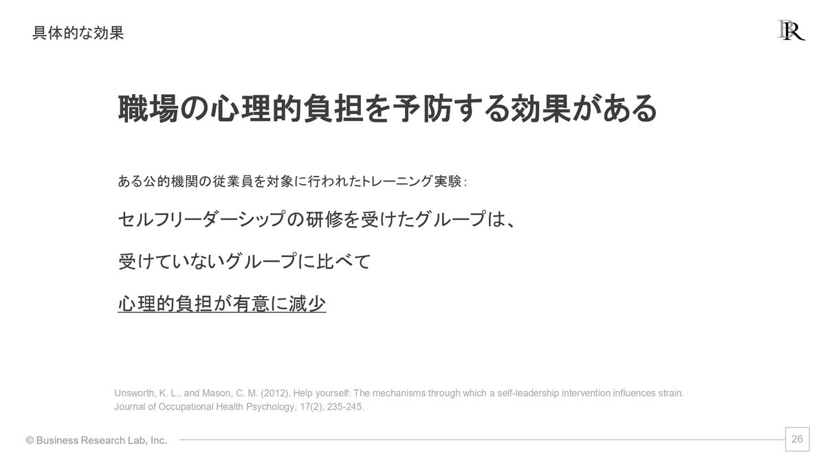 ある公的機関の従業員を対象に行われたトレーニング実験があります。その研究によると、セルフリーダーシップの研修を受けたグループは、研修を受けていないグループと比べて、心理的な負担が有意に減少することがわかりました。要するに、セルフリーダーシップを高めることは、心理的な負担を減らす効果を持っていることがわかったということですね。あと、「セルフリーダーシップって高められるんだ」というのが、ここからもわかるかと思います。