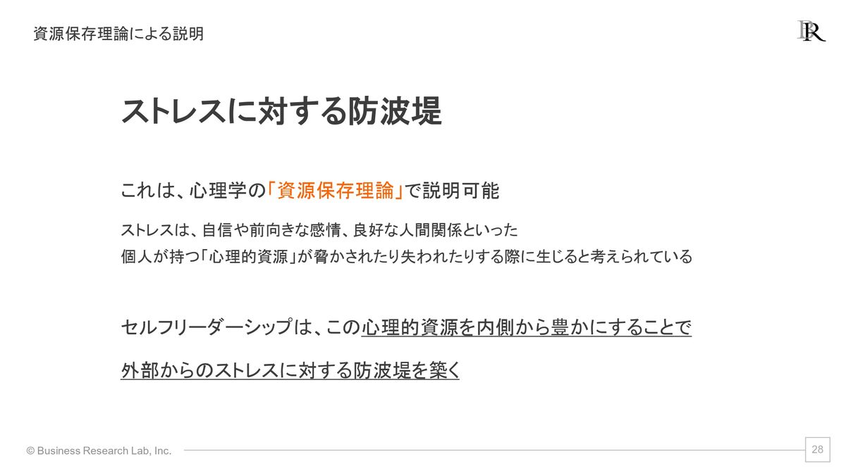 ところが、セルフリーダーシップをうまく発揮していると、この心理的資源を豊かに持つことができるようになります。要するに拡充できるんですよね。そうすると、資源が豊かにある状態なので、脅かされたり失われたりすることが幾分か緩和されます。その結果、ストレスに対してある種の防波堤のようなものができてくるというのが、セルフリーダーシップの効果になっています。