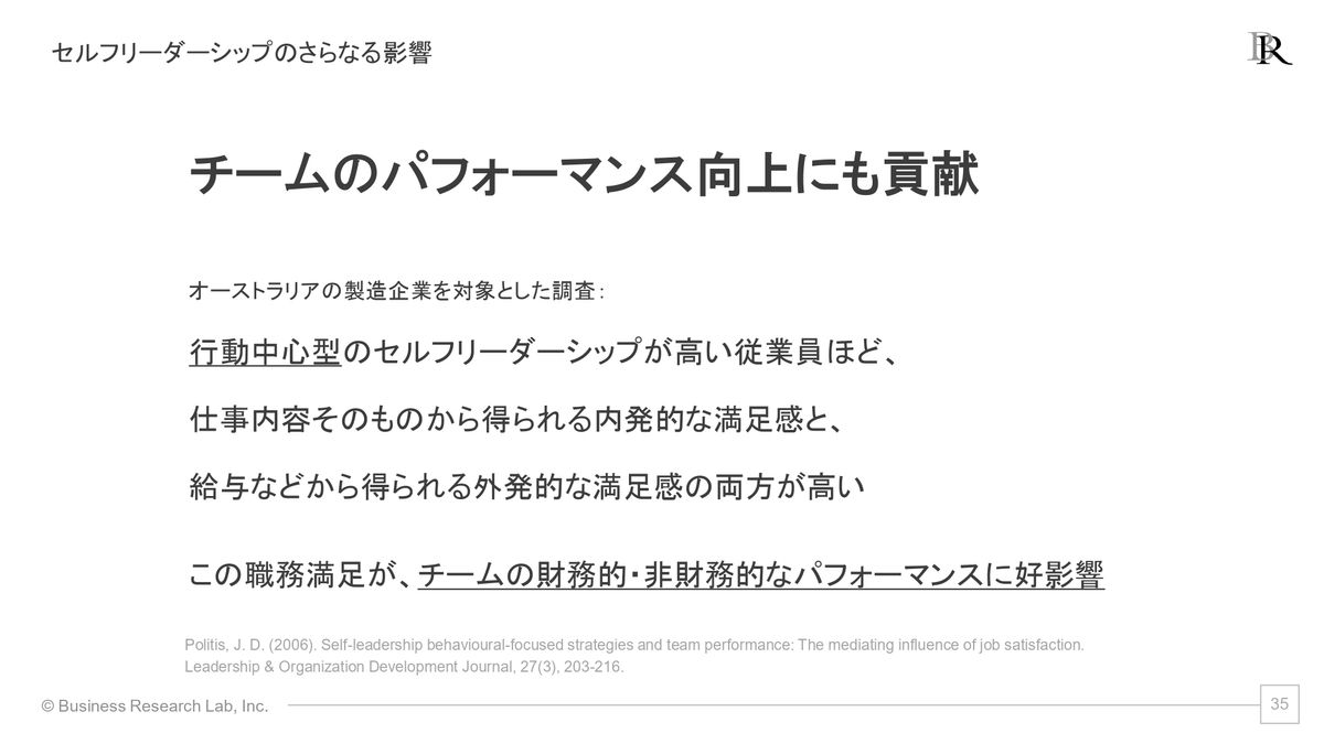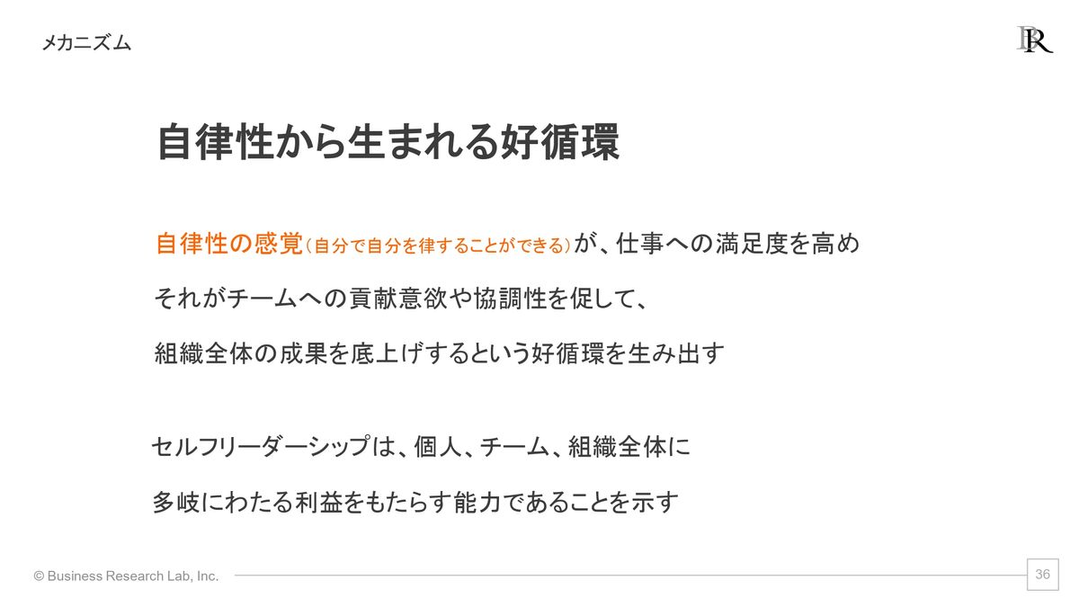 「セルフ」と呼ばれると個人だけの話に閉ざされているような感覚がしてしまうんですが、実際に実証研究の結果を見てみると、自分で自分を導くことができる従業員は、個人のパフォーマンスが高いだけではなくて、そういった人たちがいることによって、チームのパフォーマンスも引き上げられる効果がある。