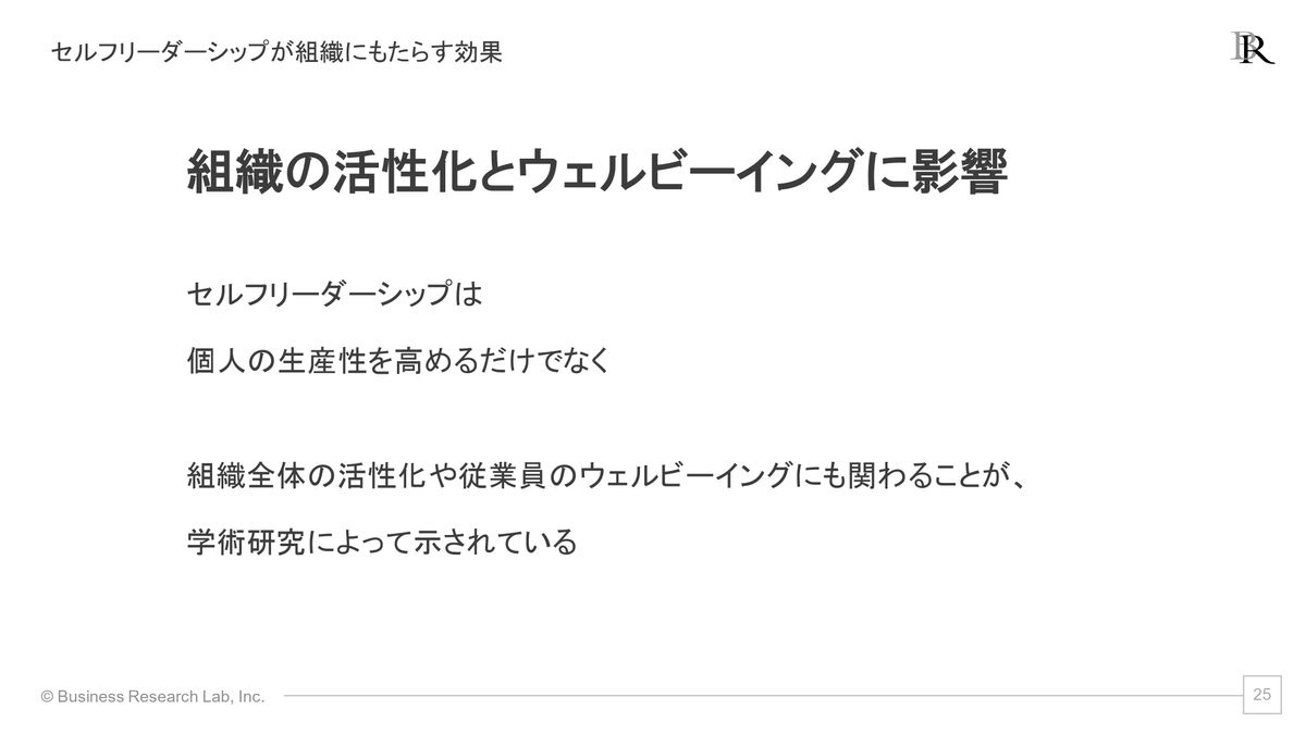 伊達洋駆氏:続いて、「なぜセルフリーダーシップが重要なのか?」ということを紹介させていただきます。セルフリーダーシップの効果を一言で言うと、個人の生産性を高めること。これはイメージしやすいですよね。
