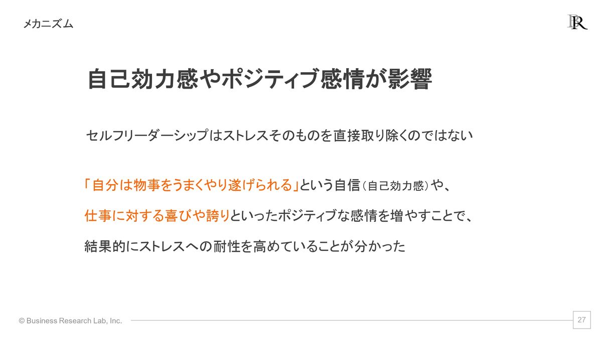 この研究を掘り下げてみていくとおもしろいんですが、セルフリーダーシップを高めたということそのものが、いきなりストレスを取り除くというわけではなくて、セルフリーダーシップが高まることによって、「自分は物事をうまくやり遂げられる」という、いわゆる自己効力感が高まる。あるいは仕事に対する喜びとか誇りといった、いわゆるポジティブな感情が高まっていく。