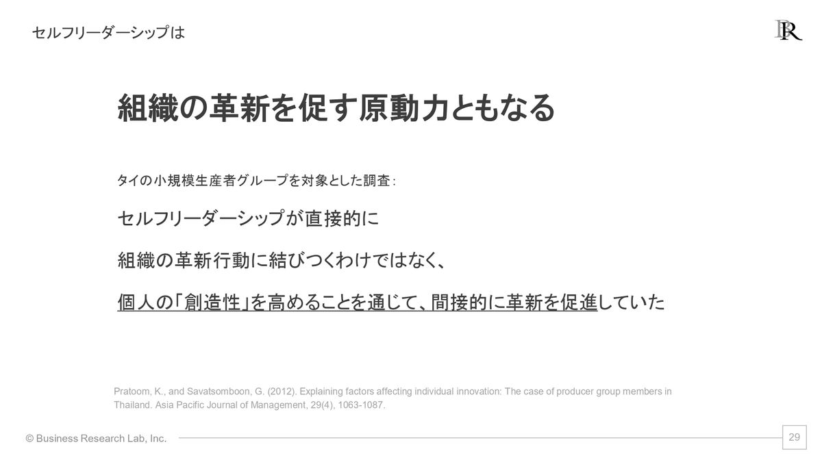 これはタイの小規模生産者グループを対象とした調査に基づく結果なんですが、セルフリーダーシップが個々人の創造性を高める。その結果、組織の革新行動・イノベーション行動を促していくということがわかりました。