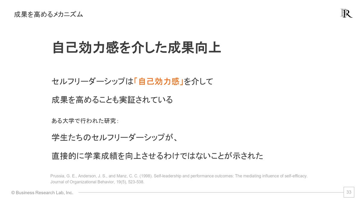 今までも軽く触れたのですが、具体的にはセルフリーダーシップが自己効力感、すなわち自分の能力に対する自信を高めた結果、パフォーマンスが高まるということを検証した研究があります。