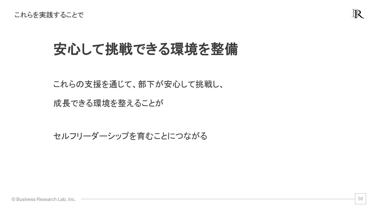 このように、部下が安心して挑戦できて成長できる環境を整えていくことが、セルフリーダーシップを育み、そしてセルフリーダーシップを発揮することが、個人の成果、それから集団の成果につながっていき得るのかなと思います。