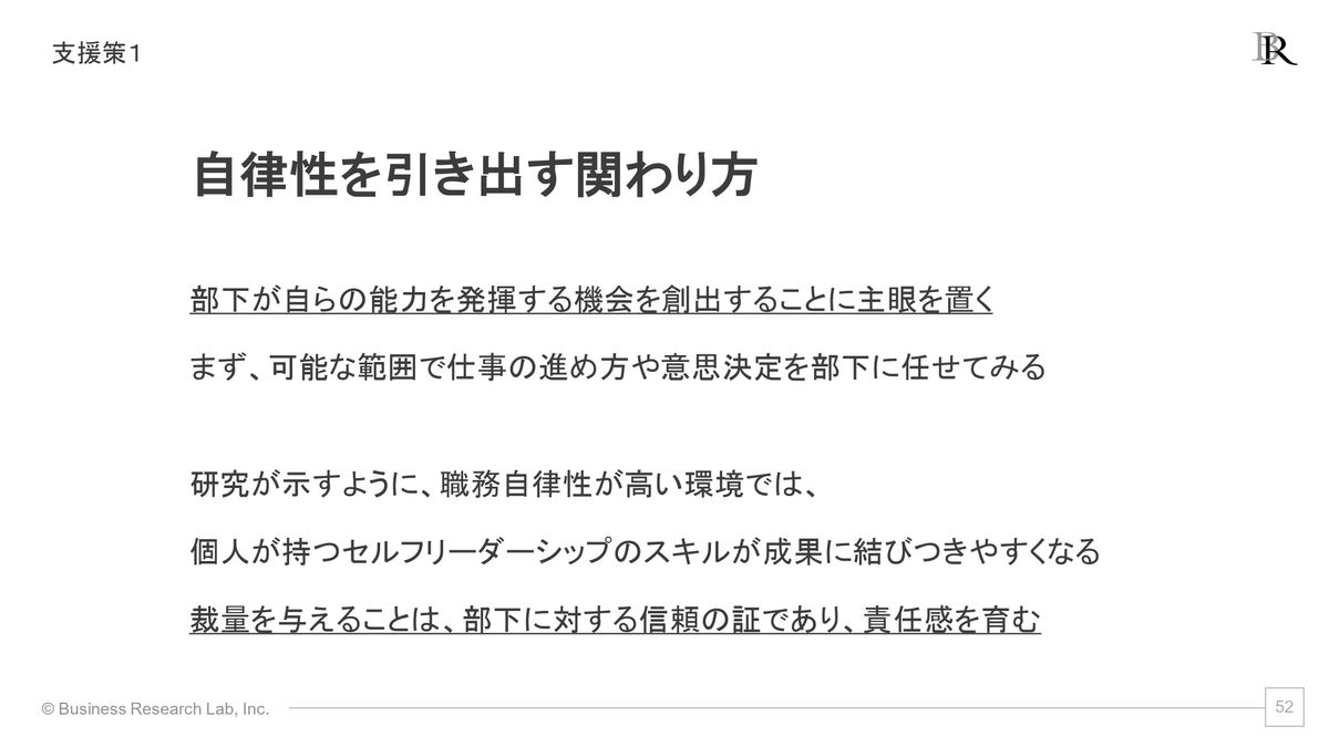 具体的には、職務自律性が高い環境だと、セルフリーダーシップが成果に結びつきやすいという研究知見があったかと思うんですが、要するに裁量を与えていくということは基本的な原則にはなるかなと思います。