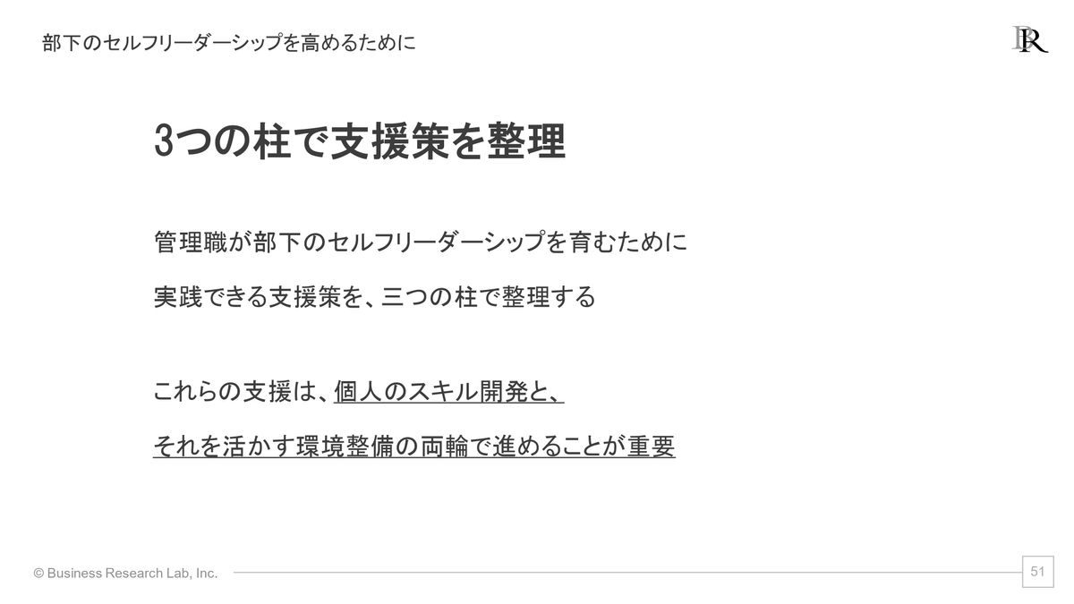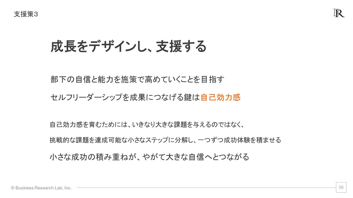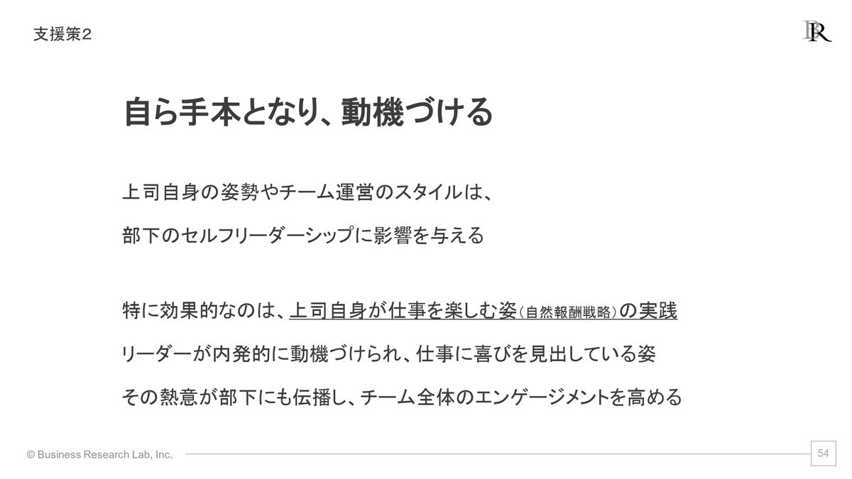 そうなると、部下もセルフリーダーシップを発揮しやすくなってくる。「こういったことをやればいいんだ」というロールモデルになるわけですね。自分がお手本となるということも、1つできる支援策ではなかろうかと思います。