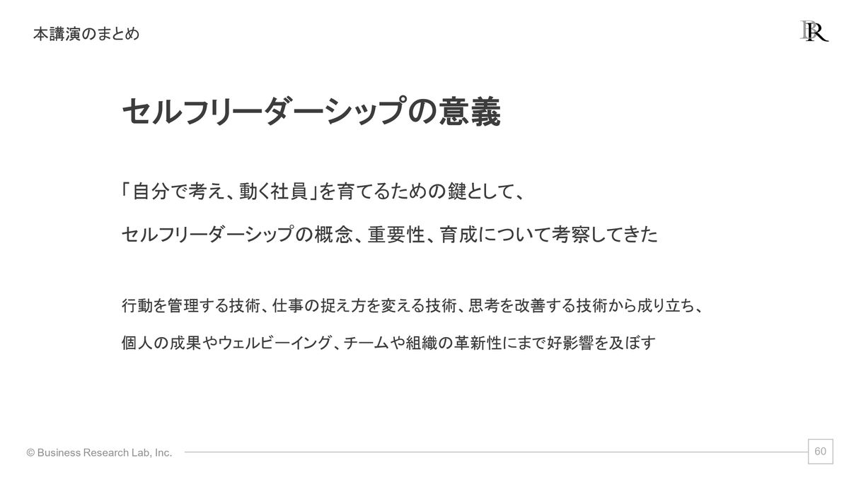 セルフリーダーシップの育成というのは、個々人の単なる自己管理力を高めることを超えて、実は次世代リーダーを育てる第1歩にもなっていると考えられるのかなと思います。そういった点でも、セルフリーダーシップを高めていくことは有意義ではないかということで、私からの講演は終了とさせていただきます。