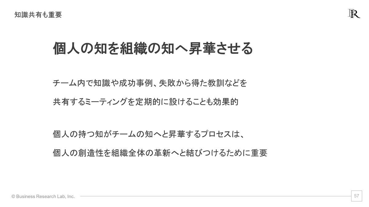 具体的には、例えばチーム内で知識や成功事例、失敗から得た教訓を共有するような機会を定期的に設けるとか。そういったことを行っていくことができれば、個々人が得た知識とか気づき、そして学びをチームの知に変えていくことができるわけですね。