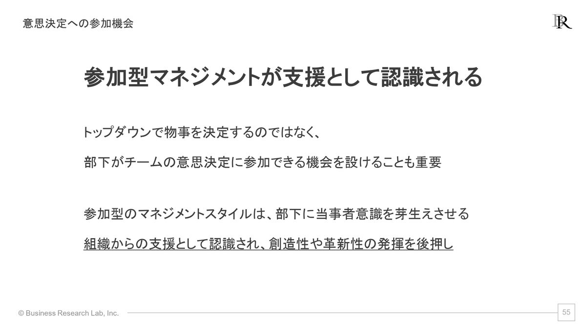 つまり厳密に言うと、それは(セルフリーダーシップを)発揮できていないということにもつながっていってしまいます。なので、できる限り当事者意識が芽生えるような、意思決定への参加を促していく必要があるのかなと思います。