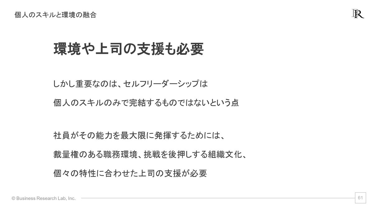せっかくセルフリーダーシップを高めていくわけですから、それが発揮しやすい環境、それからそれが成果につながっていきやすいような環境を同時に整えていく(ことが必要)ということが、これまでの研究からは示唆されるところかなと思います。