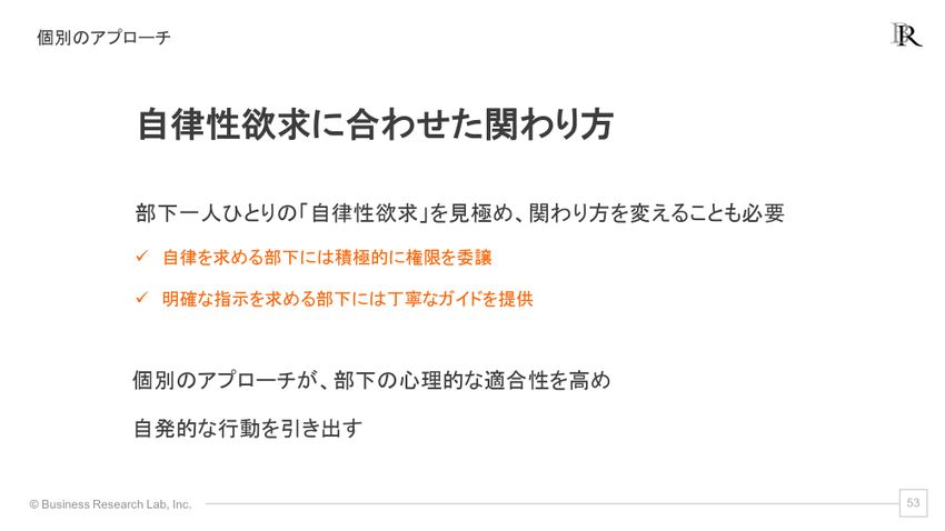 ただ、先ほどのとおり、自律性欲求は部下一人ひとりで微妙に違ってくる可能性があります。自律を求める部下に対しては積極的に権限委譲を行うような、エンパワーメント型リーダーシップが有効になるかと思います。逆に「自律性をぜんぜん求めていません」という人に対しては、丁寧にガイドを示していくことが重要になってくるかもしれません。