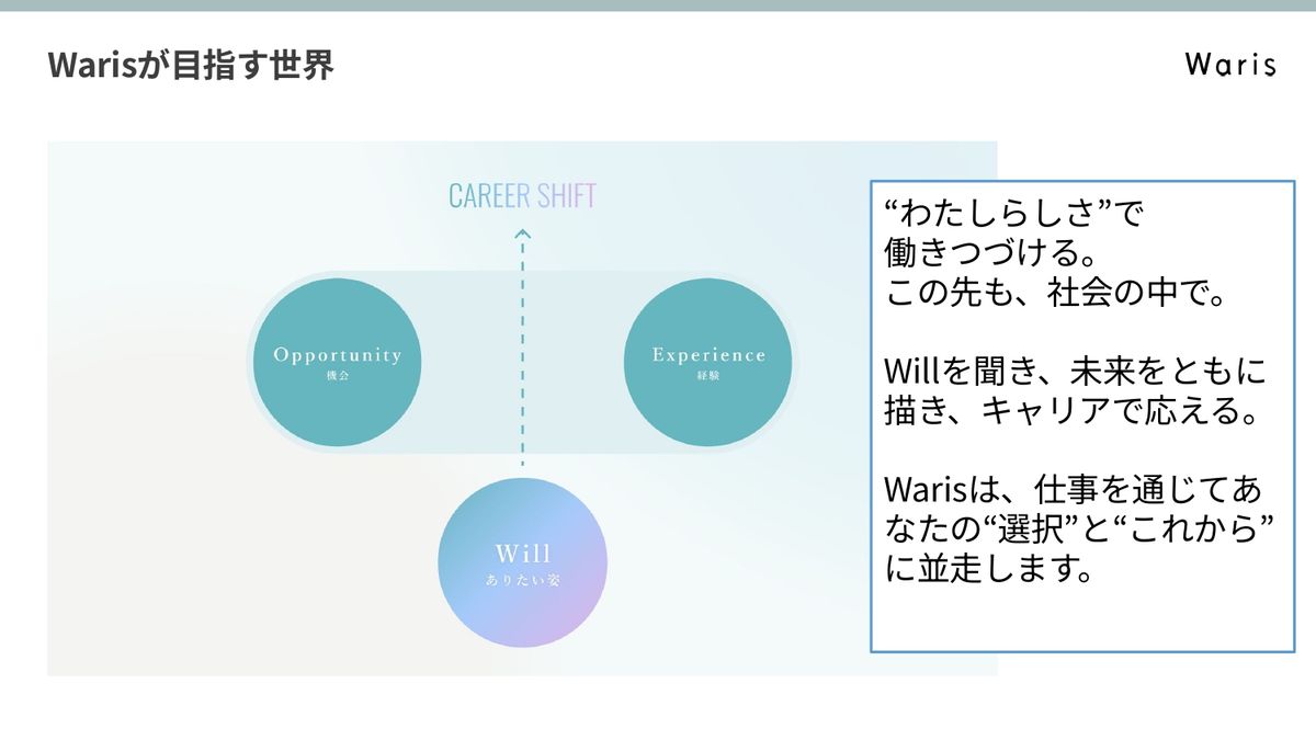 画面右端に「『わたしらしさ』で働きつづける。この先も、社会の中で。」と書かせていただいているんですけれども、私どもWarisとしては、職業を通じて、みなさんの「選択」とか「これから」に伴走していきたいという思いで日々活動しております。