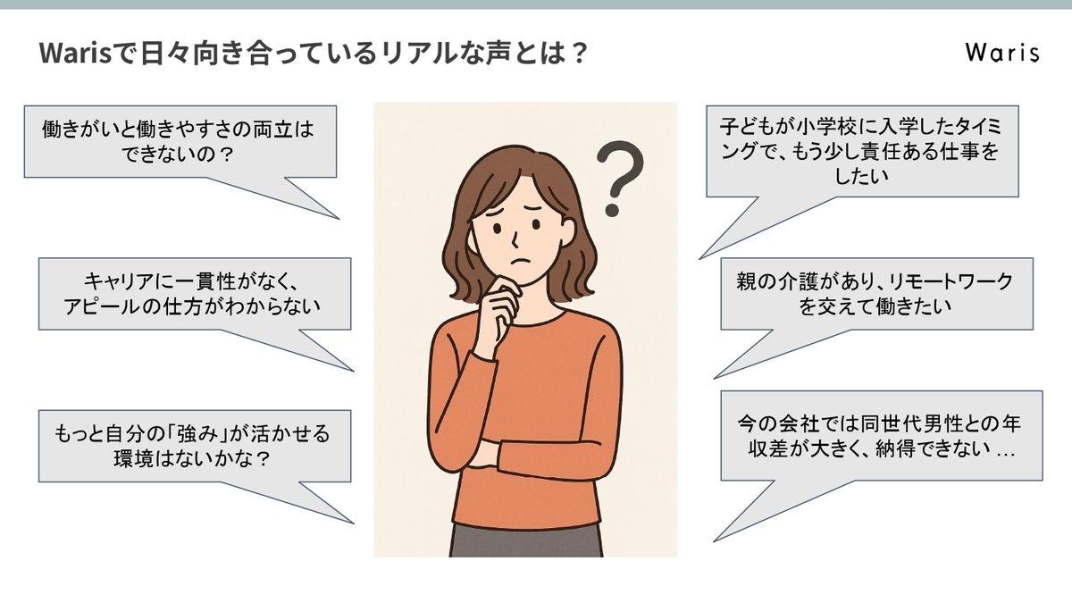 こういった、働き方を主軸とした転職動機でご相談いただくケースも、実際にすごく多くあります。私自身はWarisのコンサルタントで、ライフステージによる働き方の変化を経験してきているメンバーですので、ご状況とかお気持ちは本当によくわかるなと思いながら、日々お話をうかがっております。