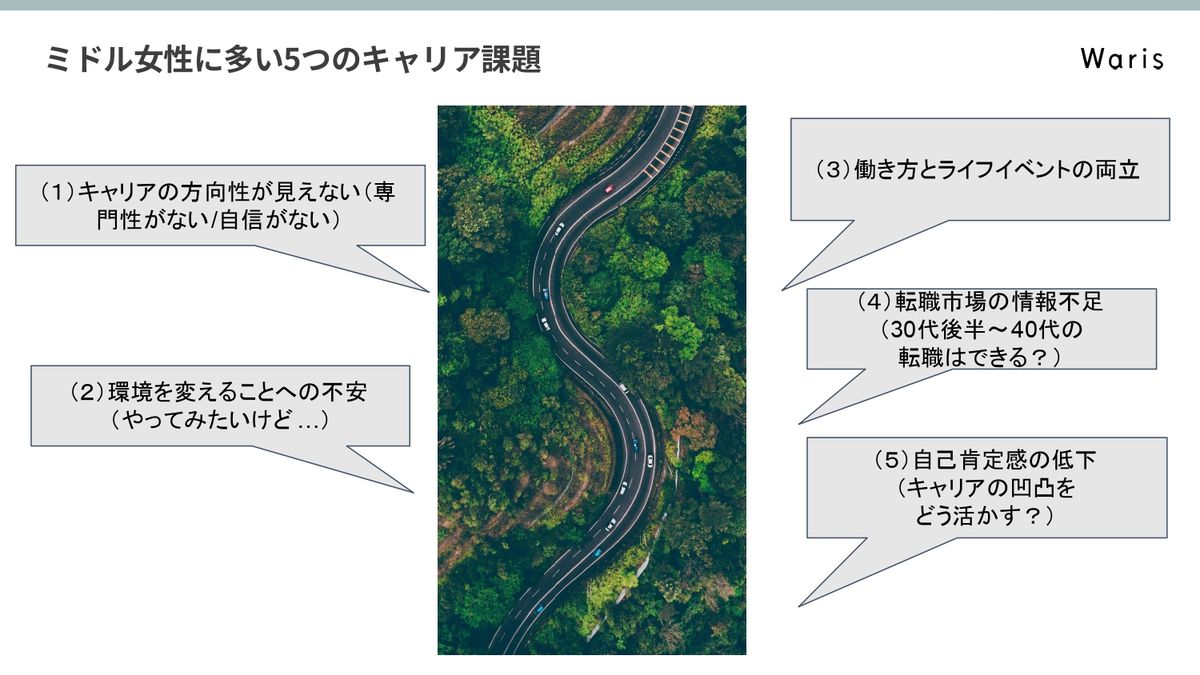ということで、私どもなりに「ミドル女性に多い5つのキャリア課題」を、図表のようにまとめてみました。1つ目は画面左上ですね。やはりキャリアの方向性が見えない、見えづらい。あるいは、先ほど相武も申しておりましたように、「何かちょっとコアキャリアがないような気がする」というところとか、「自信が持ちづらい」というようなお声はよくあるところです。