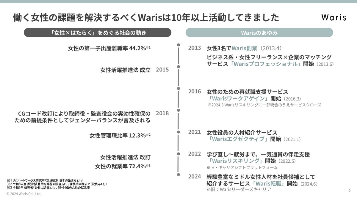 田中:(スライドを示して)ご覧いただいている図表が私どもの歩みになります。みなさまも2013年当時に何をされていたかを思い起こしていただけたらと思います。私どもがスタートしたのは2013年でしたが、当時は女性の第一子出産離職率が44.2パーセントというような状況でした。