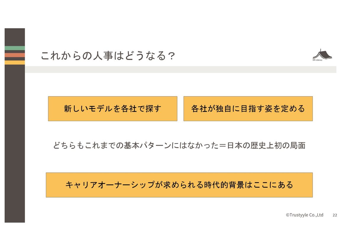 ここにキャリアオーナーシップが求められる時代的な背景があるなと思っています。なぜならば、「組織全体や会社はどういうモデルならいいのか?」「何がいい働き方なのか?」「どうすれば我々は願っている姿になっていけるのか?」ということ自体をめちゃくちゃ模索しながら動いている中だからです。