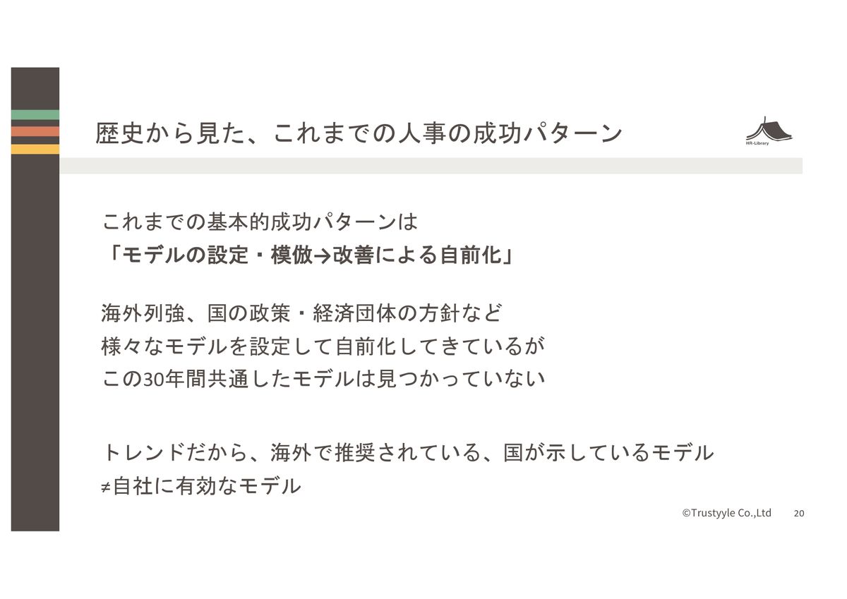 こういうことが起こっているんですけど、我々の力学というのは、今までの「モデルを模倣してやっていく」という力学がすごく残っています。なので、「人事はトレンドを追いかけ過ぎだ」みたいなことを言われたりとか、「流行っているものを取り入れて自社でなんとかしよう」みたいなことがうまくいかなくて、また信頼を失ってしまいがちなんですね。