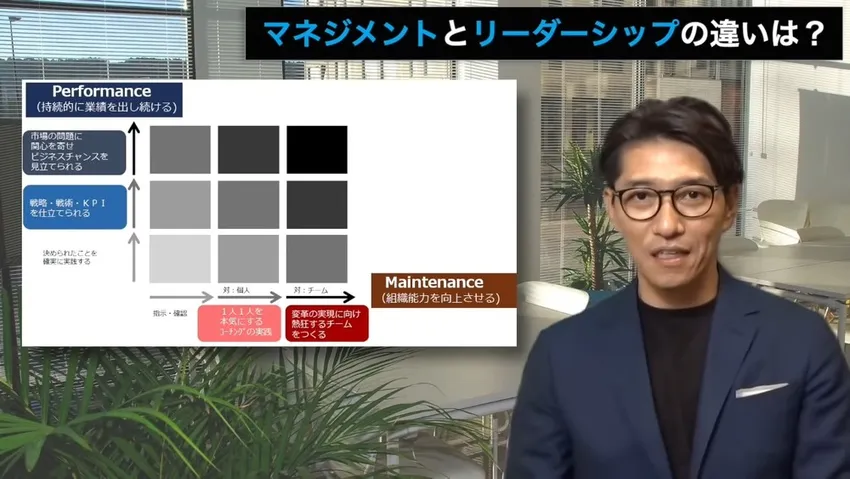 実はこれは、リーダーに必要な2つの軸を言っています。パフォーマンスは、結果を出すための力。つまり、マネジメント。横の軸はメンテナンスで、人と組織をメンテナンスする、モチベートする。それがまさにリーダーシップになります。