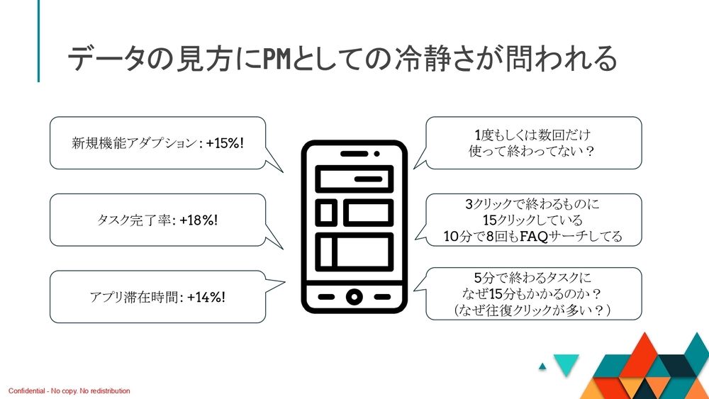 PMとしてあるべき姿というのは、このデータはもちろん喜ばしいんですけども、一方でぜひ右側の視点でも見てほしいんですね。「この数字は、本当にあるべき姿の数字なんだろうか?」ということなんです。