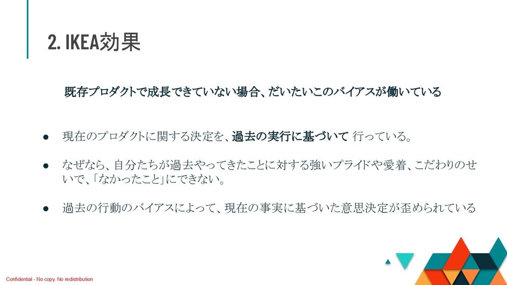 「現在のプロダクトに関する意思決定を、過去の実行に基づいて行っている」と。どういうことかというと、自分たちが過去にやってきたことに対する、強いプライドや愛着ですね。このこだわりのせいで、過去にやってきたことを「なかったこと」にできないということなんですよ。