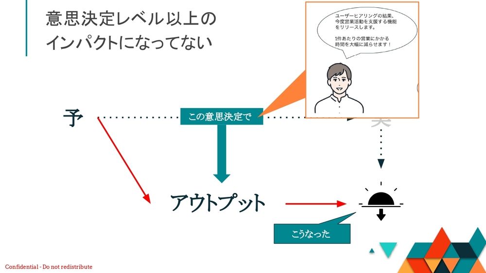 「ユーザーヒアリングの結果、今度は営業活動を支援する機能をリリースします。1件当たりの営業にかかる時間を大幅に減らせます」という部分です。「この機能を作ろう」と思ったこの意思決定でアウトプットを作って、最後はサンセットしてしまったと。つまり、この意思決定レベル以上のインパクトになっていないんですね。