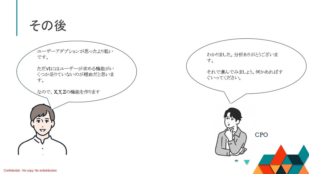 結果的にどうなったか。「ユーザーアダプションが思ったより低いですね。よくよく考えると、v1(バージョン1)にはユーザーが求める機能がいくつか足りていないのが理由だと思います。なので、XとYとZの機能を作りましょう」とPMは提案をするわけですね。