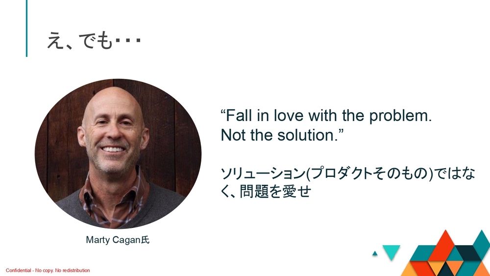 これはどういうことかというと、「ちょっと待ってくださいよ。マーティ・ケーガンさん(プロダクト・エグゼクティブ)が、『Fall in love with the problem, Not the solution.(ソリューション(プロダクトそのもの)ではなく、問題を愛せ)』と言うじゃないですか」という話は当然あります。