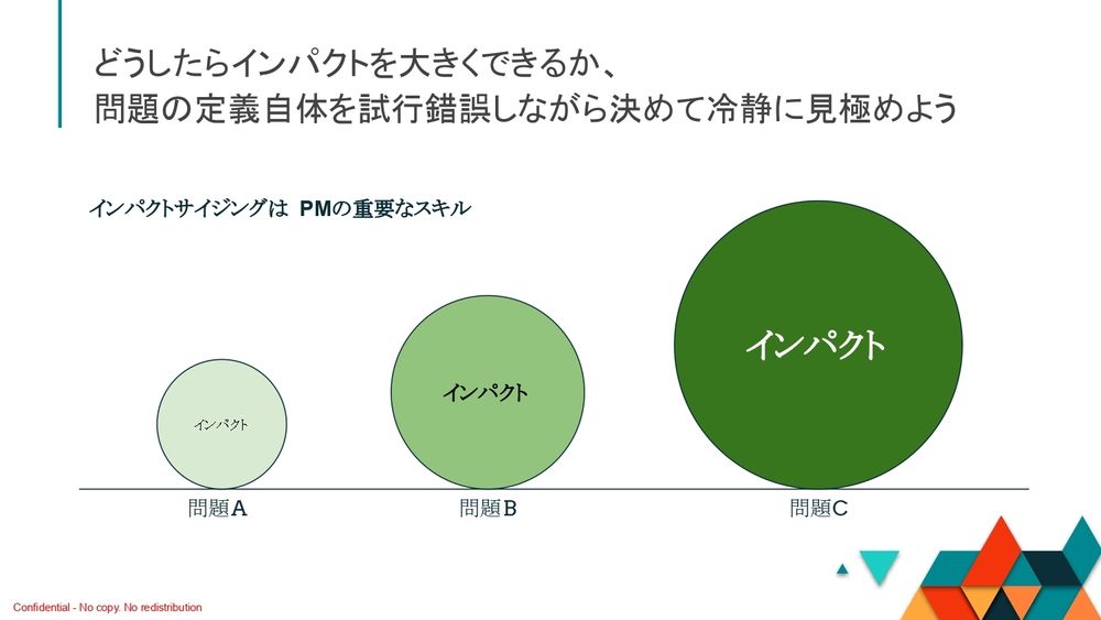 「どういう定義の仕方をすれば、インパクトが最大になるんだろう?」という角度でぜひ問題を見てほしいんです。あるいはユーザーの声を分析したり、ユーザーヒアリングを進めたりというところですね。ということで、インパクトサイジングというのは、PMにとって非常に重要なスキルになります。