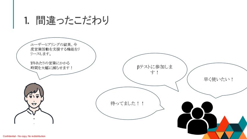 あるPMの方が「ユーザーヒアリングの結果、今度営業活動を支援する機能をリリースします。1件当たりの営業にかかる時間を大幅に減らせます」と、ばーんとプランをシェアするわけですよ。
