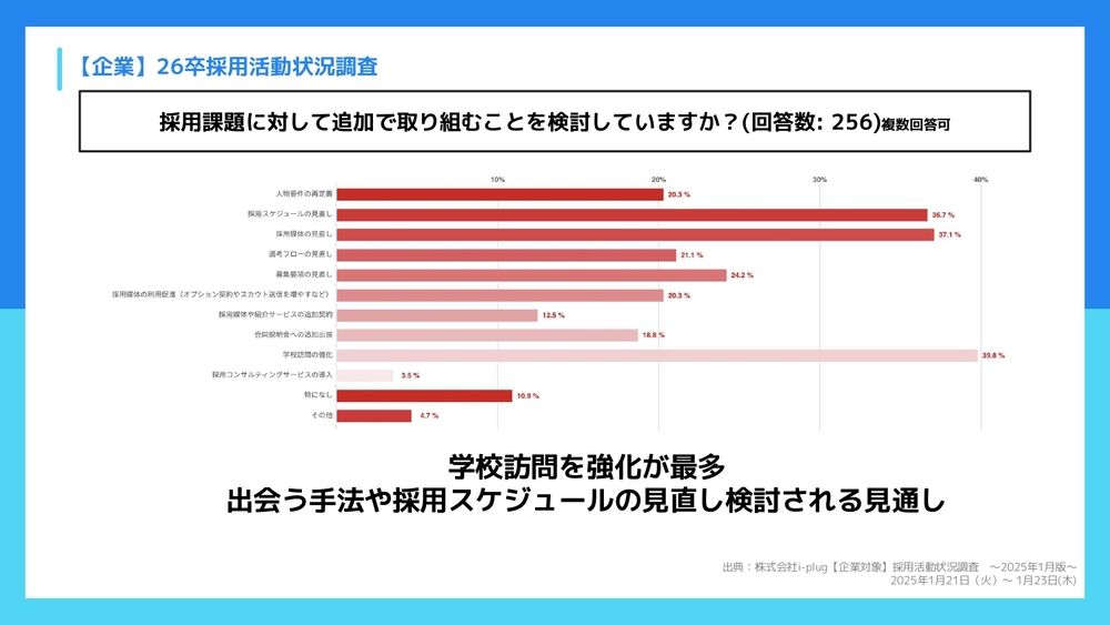鷹野:そうなんです。学校訪問という選択肢がここまで高い得票数になったのってあまりなくて。正直ここって、毎年だいたい採用のスケジュールや媒体の見直しといった、今このトップ2・3で出ているご回答が多かったんです。