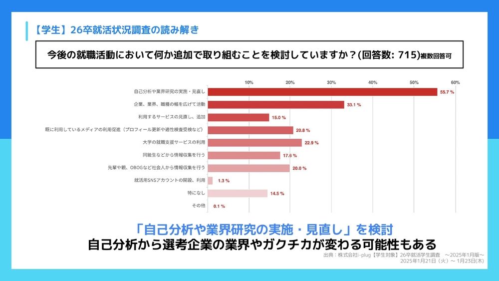 前本:ありがとうございます。ここまで内定までの接触回数についてだったんですが、続いて「今後の就職活動において何か追加で取り組むことを検討していますか?」という質問ですね。