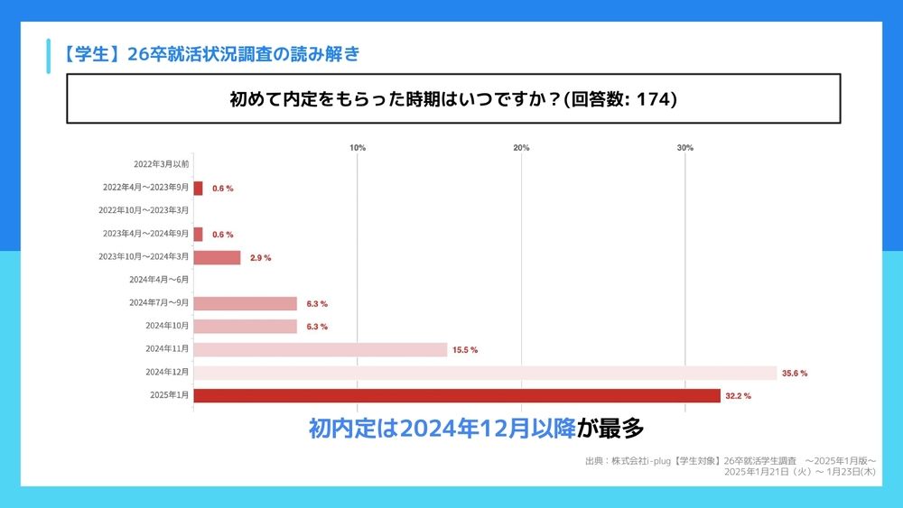 前本:ありがとうございます。ここから続いて「初めて内定をもらった時期はいつですか?」ということで内定をもらった割合もいつもよりも非常に多くなっていますが、いかがでしょうね?
