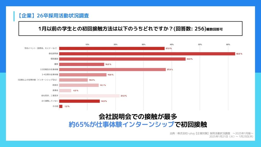 前本:そうですね。ありがとうございます。ここまでが会社さんへのアンケートの調査でして、1社1社におそらく(採用の)やり方とか、どういうふうに進めていけばいいのかというのはあったりするんでしょうけど。