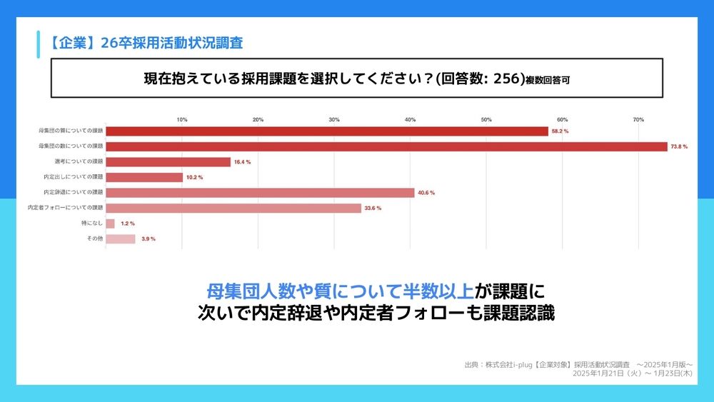 まず1つ目の「26卒採用活動状況調査」からです。これは企業さんへのアンケートになるんですが、「現在抱えている採用課題を選択してください」というご質問への回答ですね。いかがでしょう、鷹野さん?