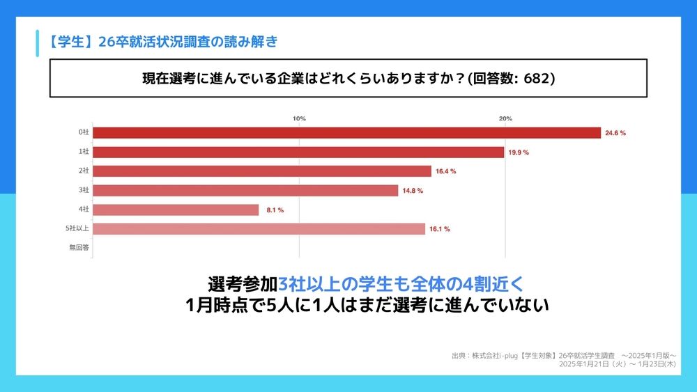 鷹野:逆に選考に進んでいない学生さんは5人に1人だけです。24.6パーセントで、もうほとんどの学生さんは何かしらの企業さんの選考に進んでいると。これが思惑として、「物は試しや」というかたちで進んでいるのか、本命のところを受けているのかはなかなか定かじゃないんですけども。