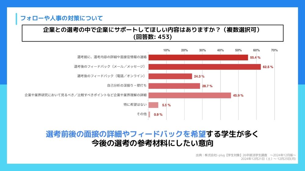 前本:なるほど。ありがとうございます。一緒に整理をしながら進めていくというところもそうですし「企業さんとの選考の中で企業にサポートしてほしい内容はありますか?」という質問です。