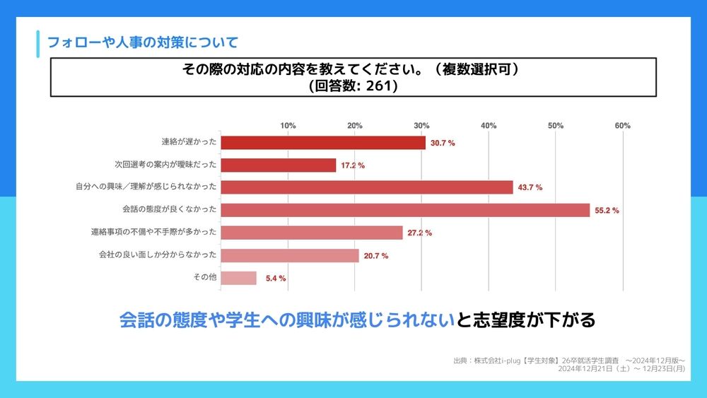 「フォローや人事の対策について」というところになるのですが、こちらも学生さんのアンケートを基に自社でどのような対策を打って、どういう打ち手ができるのかを具体的にお話ししていけたらなと思います。まず1つ目。「企業や人事の対応で、志望度が下がったことはありますか?」ということですね。
