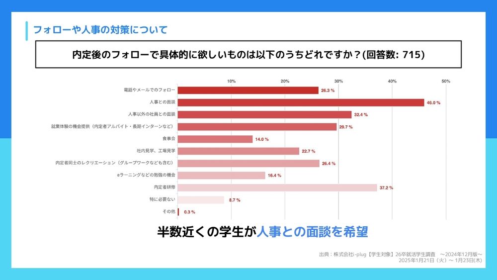 前本:ありがとうございます。続いていきますね。「内定後のフォローで具体的に欲しいものは以下のうちどれですか?」という質問です。