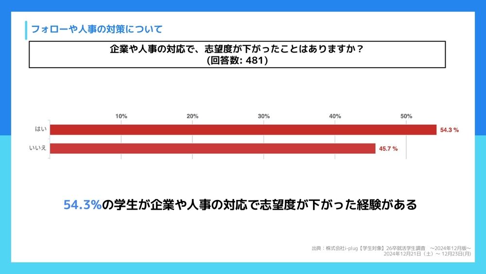 54.3%の学生が企業や人事の対応で志望度が下がった経験あり