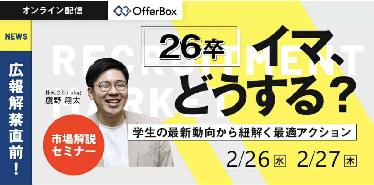 これから本格化する採用に向けて、本セミナーでは「26卒の市場トレンドと最適アクション」を解説します。直近の学生/企業の動向データから読み解く傾向や、26卒採用で押さえておくべき動き方のポイントについて語ります。本記事では、新卒採用で知っておきたい学生心理と効果的なフォローについてお伝えします。